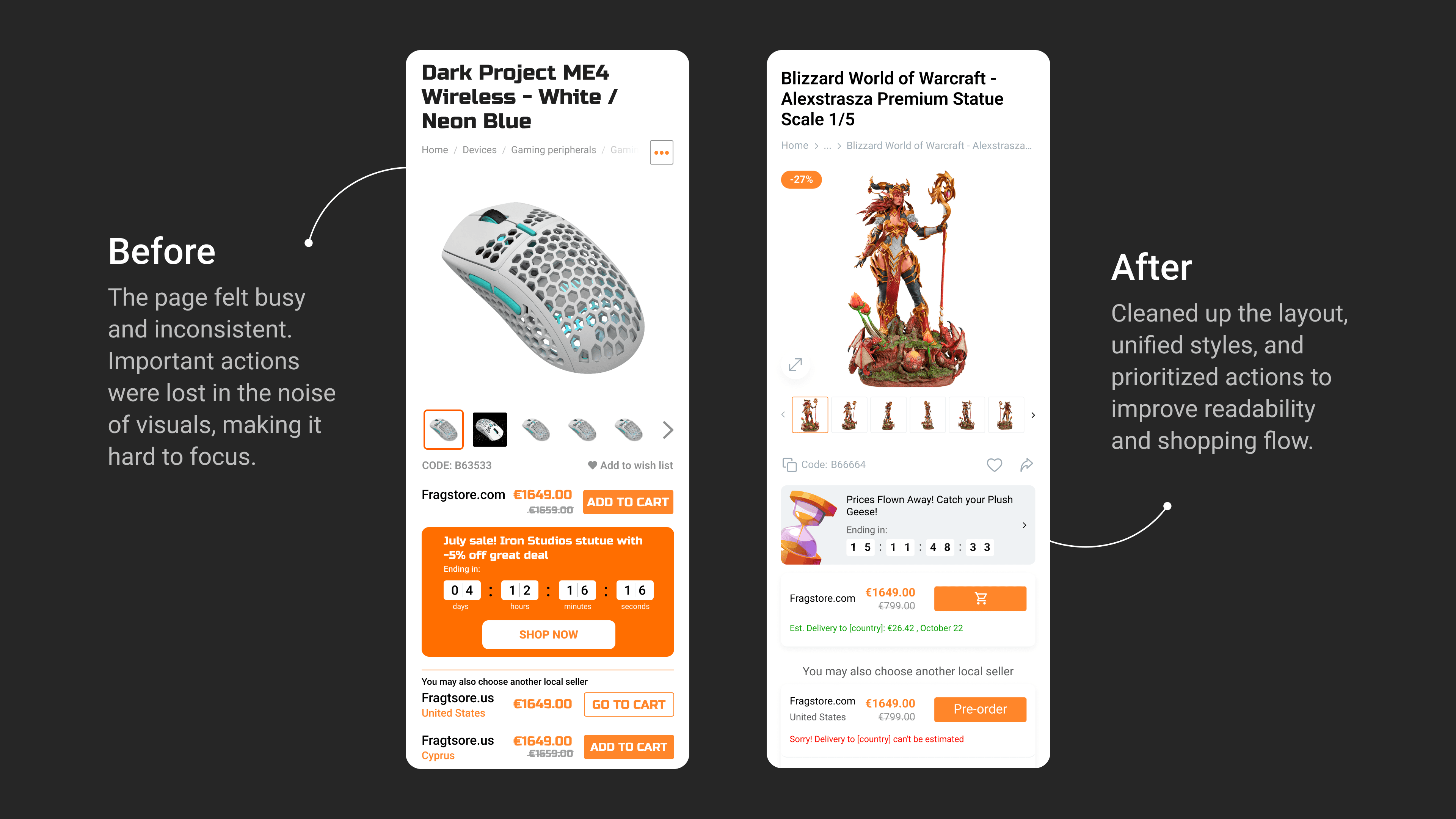 Fragstore is an international e-commerce platform offering official merchandise for gamers and e-sports fans. The checkout flow was outdated and overloaded, causing drop-offs and user confusion — especially on mobile. I led a major redesign focused on simplifying the checkout experience, modernizing the UI, and improving usability across key pages and screen sizes.